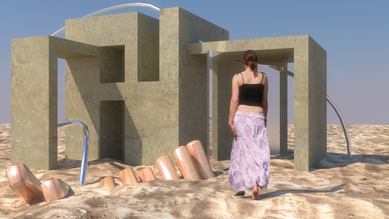 In the image above, sand and concrete are common "matte" materials with a normal blender texture. Inox is a standard lux "glossy metal" material, the wood is a "glossy" material with a blender texture, and the character is a vertical plane with an alpha texture. This one has to be set as lux texture in order to take alpha channel intoo account. Finally I added a little bit of bloom in luxrender while rendering the image.