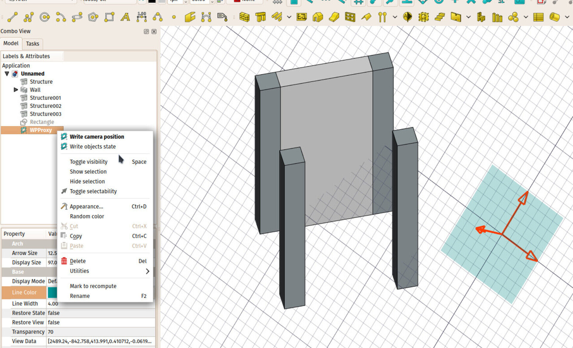This proxy object also has two more interesting features: a Restore View property, that will, when restoring the working plane to the proxy position, also restore the camera position. So you can use the proxy object to store not only the position of the working plane, but also the view angle. You can change/store the current view anytime to a proxy object, by right-clicking it in the tree.
