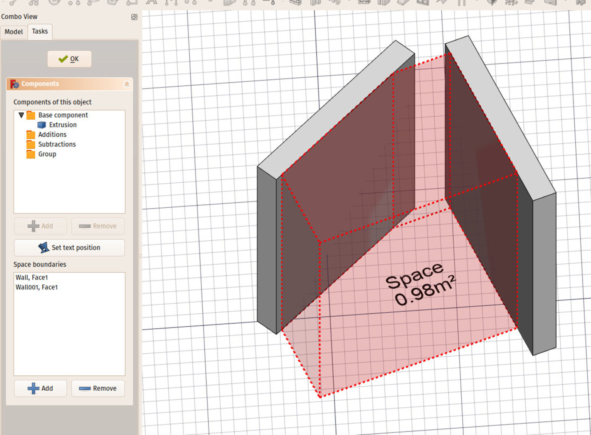 I also added UI controls to edit the boundary objects of Arch Spaces. Spaces can be based on a solid object (their shape is therefore the shape of the solid object), or a set of boundary faces (the shape of the space is therefore the bounding box of all these faces, subtracted by the volumes - or half-spaces - behind those faces), or a mix of both (the shape of the space is the shape of the base solid, subtracted by the half-spaces behind the boundary faces).