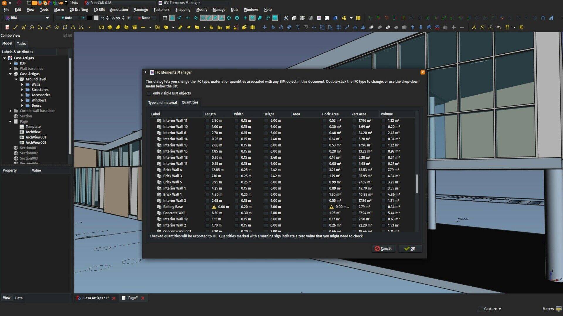 So here is how it works in FreeCAD now. The IFC Elements Manager (sorry, the documentation is not there yet at the time of writing, will work on it in the coming days) of the BIM workbench now has gained a new tab that shows available quantities for BIM objects. So far, I only considered objects that had standard, universally recognizable quantities such as width or length. This will be developed further along the way.