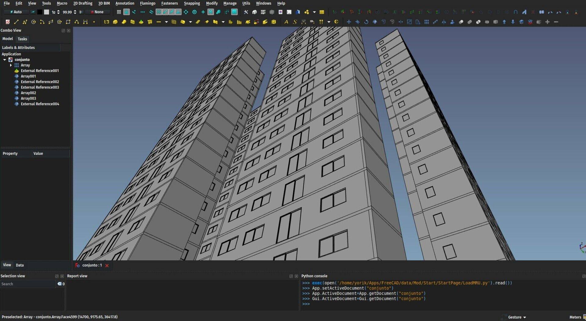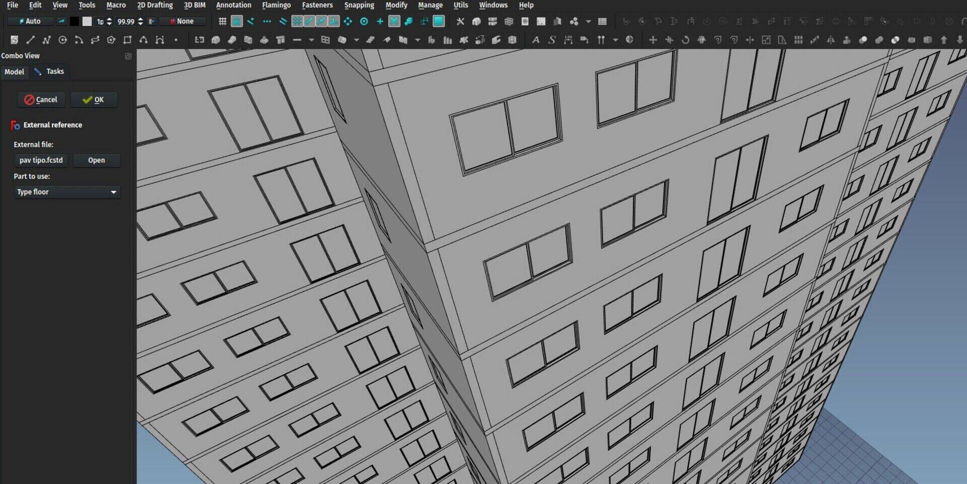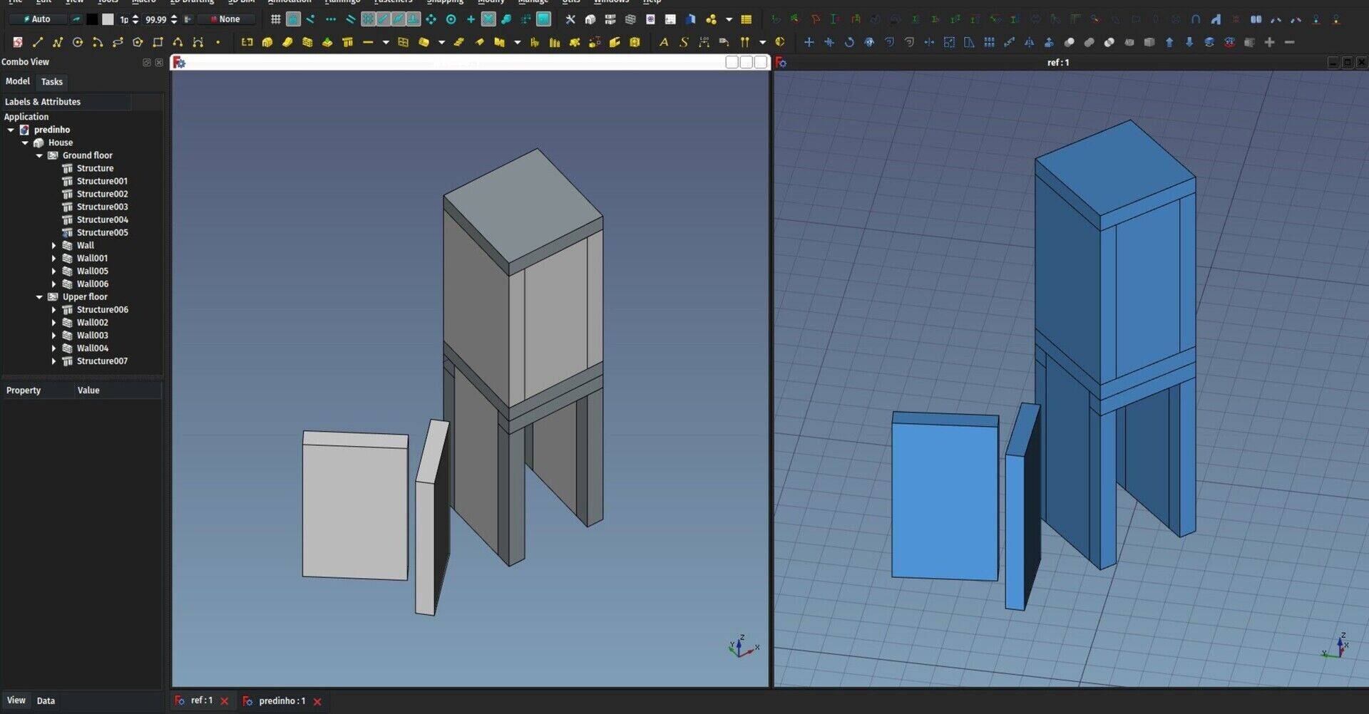 When you create a reference object, you give it a path to another FreeCAD file, then you can choose one of the included shape-based objects inside the file. The implementation is very simple: The Reference object doesn't open the included file. It just unzips the stored brep data of the object you specified. Any object with a shapecan be included, including, and that's the interesting point, BuildingParts. As I explained last month, internally, the BuildingPart always keeps a shape that is a compound of all the shapes of its children. Compound shapes in FreeCAD are very cheap and fast to produce (no boolean operation involved). So you can group anything you want, a whole storey, a whole building, etc... inside a BuildingPart, then include that BuildingPart as one single object inside another model.